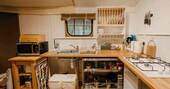 - Kitchen equipped with a gas hob, undercounter fridge with a freezer compartment, kettle, toaster, microwave