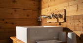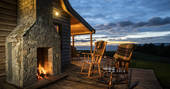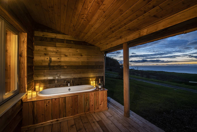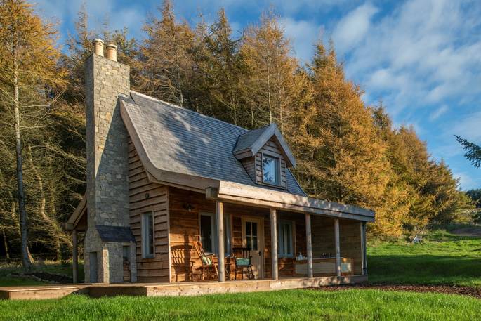 You could pick this cabin up, put it in the Rockies and it would look right at home. The big porch and rocking chairs have a real frontier feel to them, but there are a couple of less traditional touches too. First is the outdoor bath, covered by the porch but open to endless sea views. Then there’s the “backwards” chimney, which has the fireplace on the outside and makes a wonderful spot to end your day. Inside there’s a wood burner, kitchen with induction hobs, leather sofa and the king-sized bed on the mezzanine, with the sight of the sea following you everywhere you go. There’s no wi-fi and little phone signal, but for cosy nights in, there’s a dvd player and a selection of movies in the trunk. The en suite shower and loo are to the back of the cabin and out the back door there’s a path through the trees to where you’ll park. The parking area is shared with two other cabins, Baron and Bennan, but the thick forest makes each one perfectly secluded.
