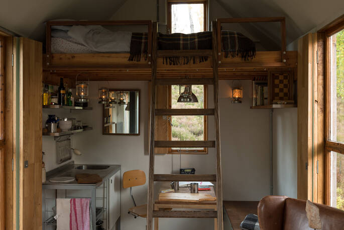Originally built to offer artist's residencies, The Bothy at Inshriach is now open to all in search of the same peace, quiet and rejuvenation. This is the kind of space you regularly tell people you're in need of. You'll find it swaddled in a copse at the far end of the Inshriach estate, with everything you need to reset yourself here. There's a couple of comfy wingback chairs on which to swirl glasses, and mull by the fire. You'll cook on the wood burner, with its hot plate and oven, make cups of tea the meditative way, fetching logs when you wake with the morning light. There's a desk where you'll write your finest works, journal, or just plan adventures into the wild around you.