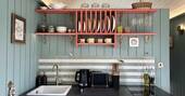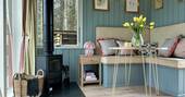 Inside, your dining table is next to the wood burner for cooler nights, or wintery stays – and is opposite the kitchen, for a nice easy serve at mealtime. Further down, you have your indoor bathroom, with a walk-in shower, after that, the bedroom – with views out to the scenic panorama.