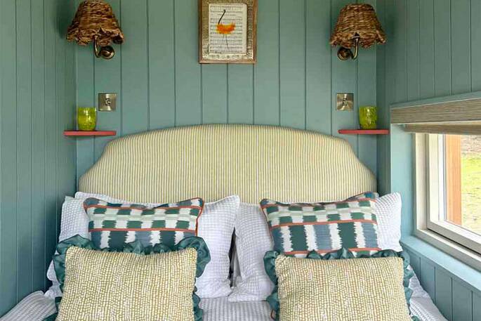Whilst Hendy wanted to ensure that guests enjoyed the sense of being on an organic working farm from the comfort of their own outdoor bath, Wheeze's keen eye for interiors and a love of colour and culture have left the cabins with a unique feel both inside and out.