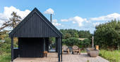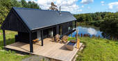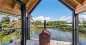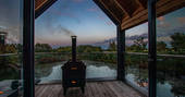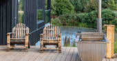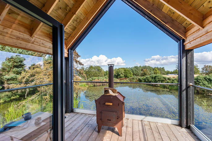 - Covered deck area overlooking the pond with wood burner, table and seating for two