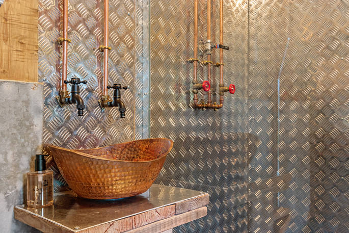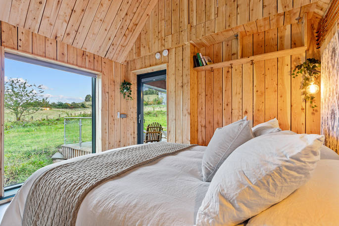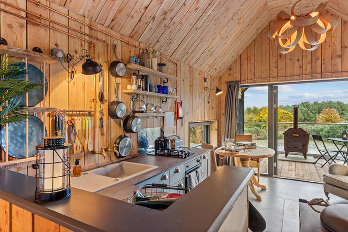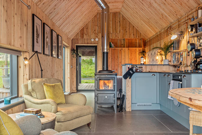 Bothan Dubh is the realisation of a lifelong dream of owner and designer, Tim and wife Suki. It feels dreamlike, too. The deck hovers out over the pond, giving an otherworldliness to soaking in the Hikki Bohemen tub as you gaze at the stars or cook on the wood-fired oven surrounded by natural beauty. The interior is a coccoon of wood and glowing copper that stops you in your tracks, sits you down and commands you to unwind. There’s a gas oven and hobs for when you don’t fancy wood-fired cooking and a couple of steps outside takes you to the separate bathroom, with a flushing loo and gas-heated shower so you can rinse off before you hit the bath or sink into the recliners on the deck after a day’s adventure. Wherever you settle - the bed, the bath, the armchairs by the wood burner - you’ll have views of water, from the pond just below to the Tay beyond, which shines in the sunrise through the huge east-facing windows, unless you lower the remote control blinds, of course.
