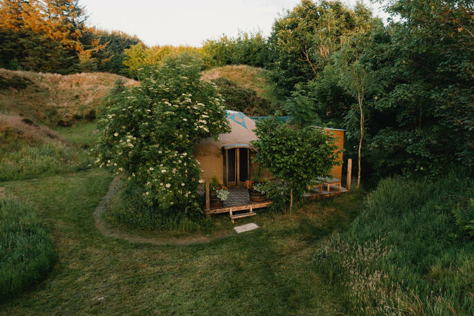 This cosy yurt is set in a wildflower meadow with views of the Pentland Hills, and surrounded on two sides by a thousand-acre forest that you can walk straight into from the back deck, down a magical gully footpath overhung with trees. Bring walking boots and binoculars as there’s wildlife galore to spot: roe deer, honey buzzards, red kites, swallows, wagtails, heron and lapwings are your closest neighbours. Returning to a session in the wood-fired hot tub is a great reward for all that exertion; afterwards, relax in the secret lounge, stocked with books on art, theatre and film as well as a selection of records and a turntable. The yurt has simple cooking facilities and a fridge, and a delightful indoor-outdoor shower and a compost loo attached. You can also cook and eat in your private woodland, with the firepit and tripod. Two sun loungers on the deck offer perfect star and sunset gazing.