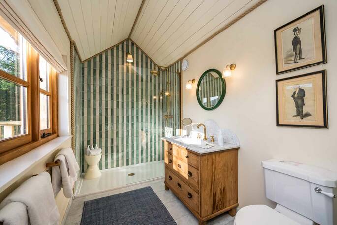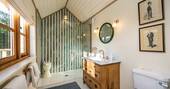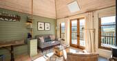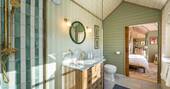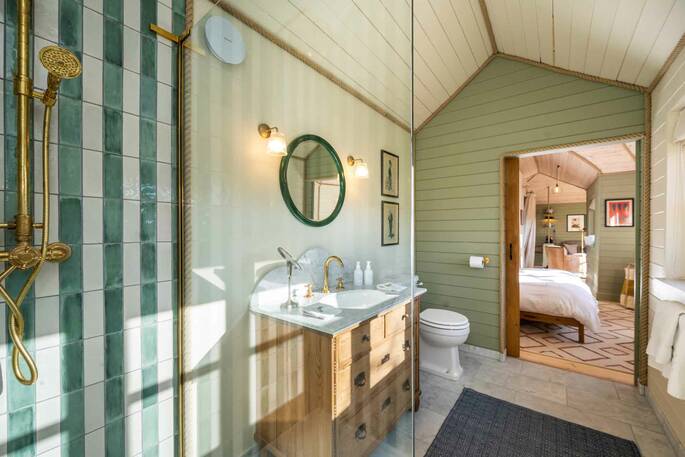 Once you’re stocked up, feet-up living can begin, and you’ll be spending sunny afternoons on the deck, or cool evenings with a book by the wood burner – casting an eye out over the far-reaching views or just entire days lazily stretched out on the super king-sized bed. One guarantee is that you’ll leave sparkling clean, when the en suite looks like this, and the view from the outdoor bath looks like that.