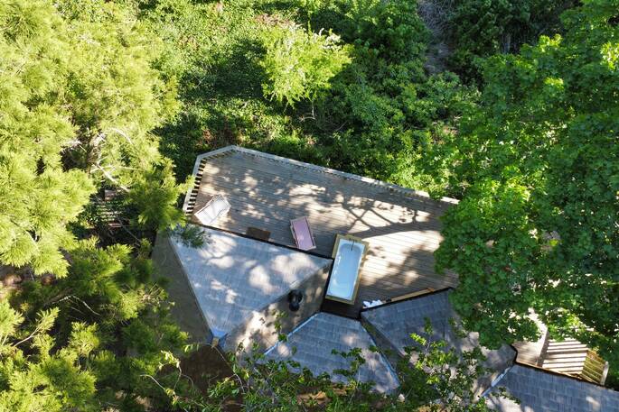 - There is an outdoor bathtub on the decking