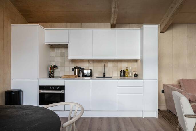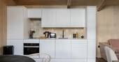 - Kitchen equipped with an induction hob, microwave oven, kettle and an electric undercounter fridge with a freezer compartment