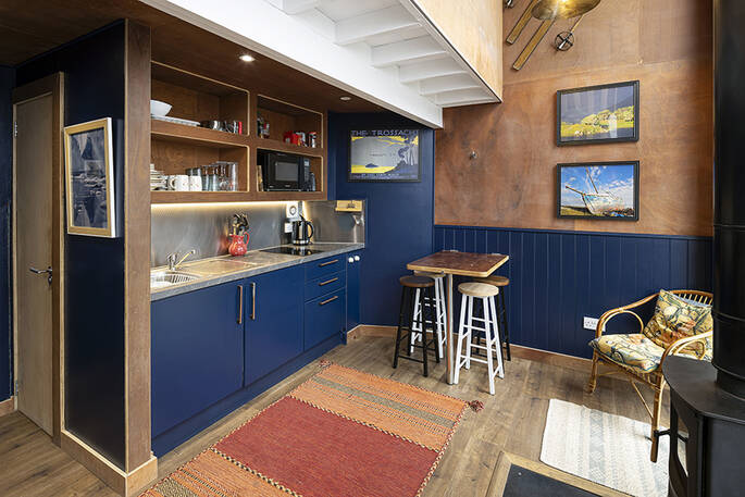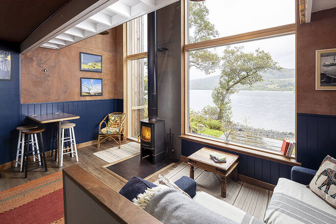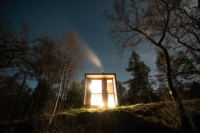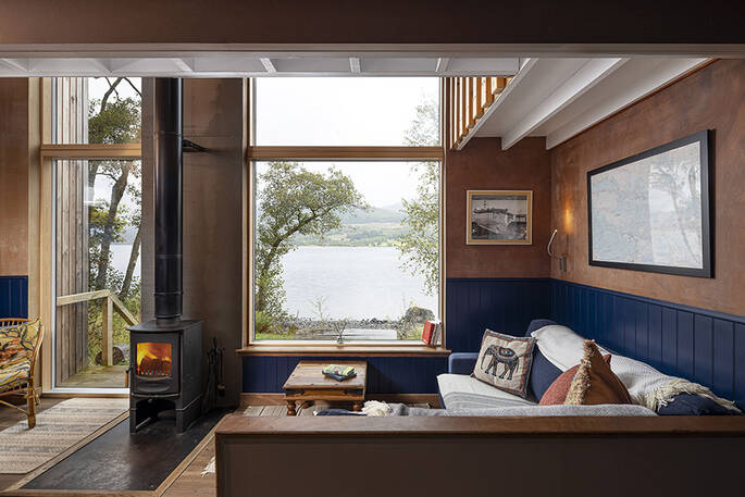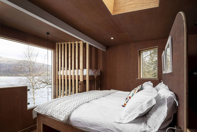 If you can’t tear yourself away from those views, then stock up and settle in. The cabin is completely self-contained, with a full kitchen, en suite bathroom and a cosy log fire making it a lovely little bubble of comfort. The bedroom, with a super king and bunk beds in one space, is a mezzanine, with one whole wall pretty much a window and no curtains, so you wake up to the light on the water unless you bring eye masks. The hot tub has views to the loch. It sits alongside two other cabins, Rowan and Alder, all with 35 metres or so between them and no facilities shared. The cabins have been designed to blend perfectly into their environment and, with the whole of the Trossachs as your playground, you’ll find yourself doing the same.