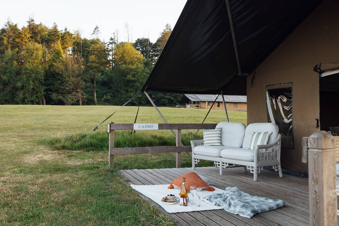 The safari tent lodges at Wonderfully Wild are a classic safari style with plenty of added Welshness, including slate hearths from local quarries and warm woollen rugs in the spacious living areas, not to mention the mountain views of Snowdonia from the outside decks. There are six lodges in total, as well as Cwt Coch, the little hut on the edge of the woods. Cadno sits in a hedge-bound field with Wennol, away from the other four but near enough if you want to take a few lodges for a get together. As well as the private showers, toilets and fully-equipped kitchens in each one, owners Victoria and Robin have toured the auctions to fill the lodges with quality upcycled furniture.