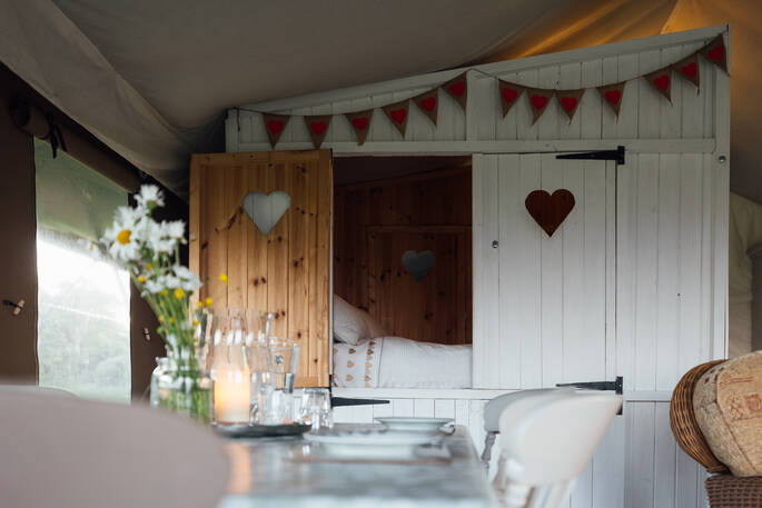 The safari tent lodges at Wonderfully Wild are a classic safari style with plenty of added Welshness, including slate hearths from local quarries and warm woollen rugs in the spacious living areas, not to mention the mountain views of Snowdonia from the outside decks. There are six lodges in total, as well as Cwt Coch, the little hut on the edge of the woods. Wennol sits in a hedge-bound field with Cadno, away from the other four but near enough if you want to take a few lodges for a get together. As well as the private showers, toilets and fully-equipped kitchens in each one, owners Victoria and Robin have toured the auctions to fill the lodges with quality upcycled furniture.