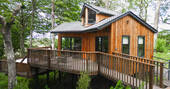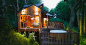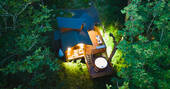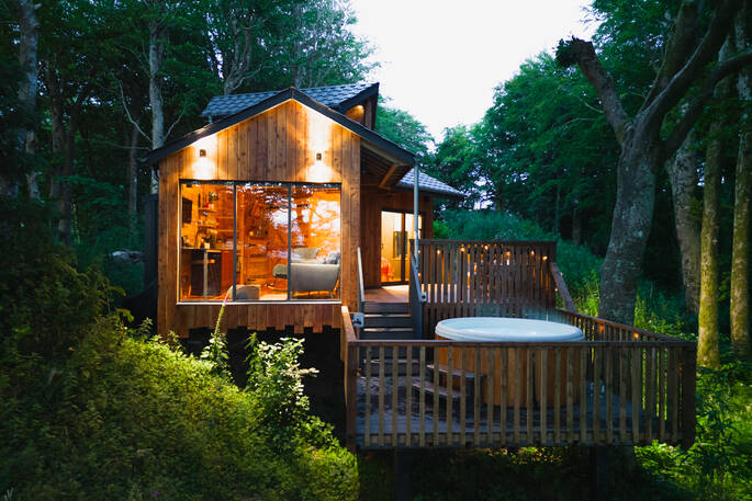 A couple of minutes walk through the woods and across a small bridge brings you to the deck of this idyllic treehouse. Designed, built and furnished entirely by owners Lowri and Alun, it’s a beautiful space that wraps its luxury in a rustic, natural style. The first thing you’ll do is explore every room and the multi-level deck, finding the double bed, the upstairs reading nook, both balconies, the hot tub, pizza oven and outdoor breakfast bar. Once you’re settled, the peace of the place will take over as you choose from the many comfy spots, lie back and listen out for the cuckoos from which the treehouse takes its name.