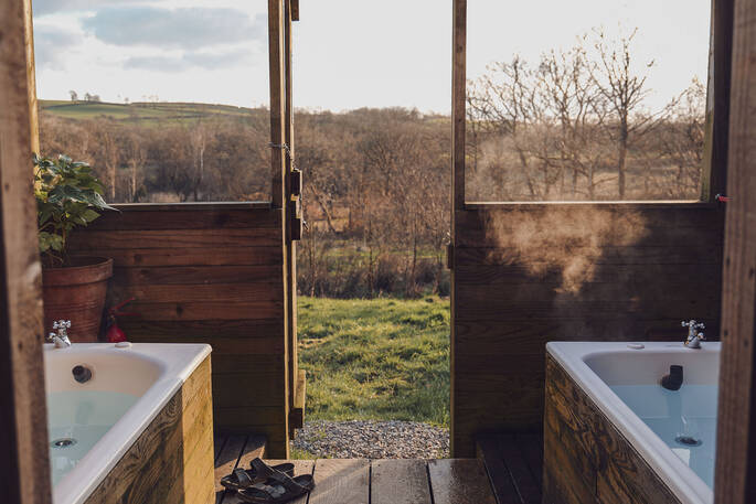 - The wood-fired twin baths can be booked for a fee of £55 per couple or £40 for one person. It will be pre-heated for your arranged time