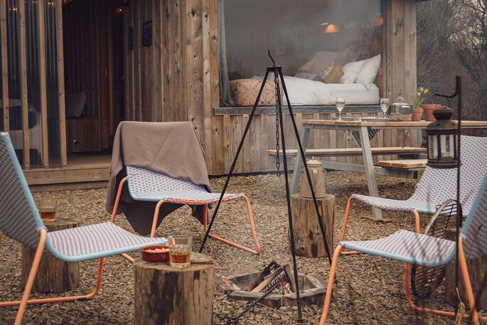 You’ll have everything you need for a few days of immersion in nature, a warm, insulated cabin, where you can keep the curtains peeled to view the milky way at night under non-light-polluted skies. There’s a camp kitchen attached to your cabin for cooking out in the fresh air, or even, on the firepit with the BBQ or camp pot. As well as a private bathroom is a short walk away, and bookable wood-fired baths!