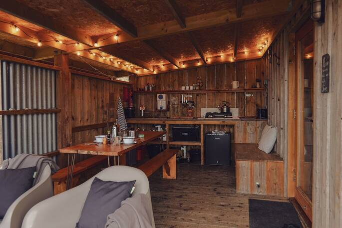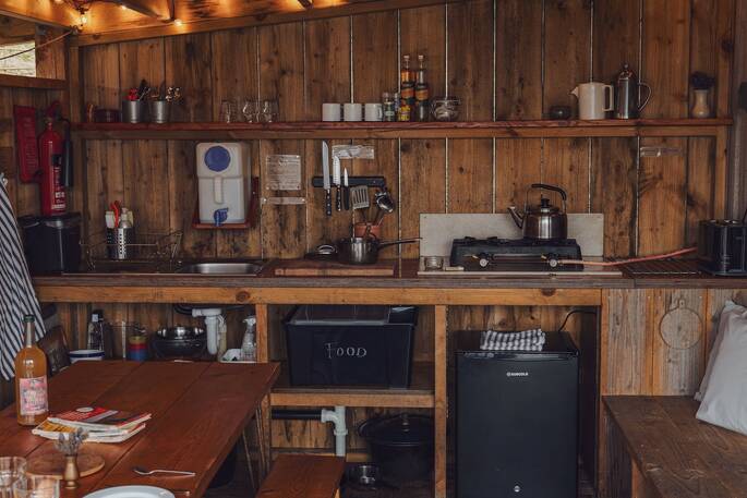 - Communal kitchen and BBQ area with a gas hob, fridge/freezer, kettle, sink and an indoor and outdoor bench for up to six guests