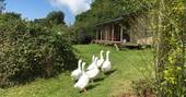 Kite Meadow is an ancient ley or hay meadow where a crop of hay is cut and baled in a traditional manner for haylage. The owners do this in late summer when flowers (knapweed, yellow rattle, ox-eye daisy, tormentil, thyme, vetch and clovers) have seeded. Their Emden geese graze Rolo meadow and the orchard. They have planted the apple trees in a circular pattern and leave the grass to die back at the summer end to form a litter layer. This is ideal habitat for mice and voles. Owls and raptors find their prey here.