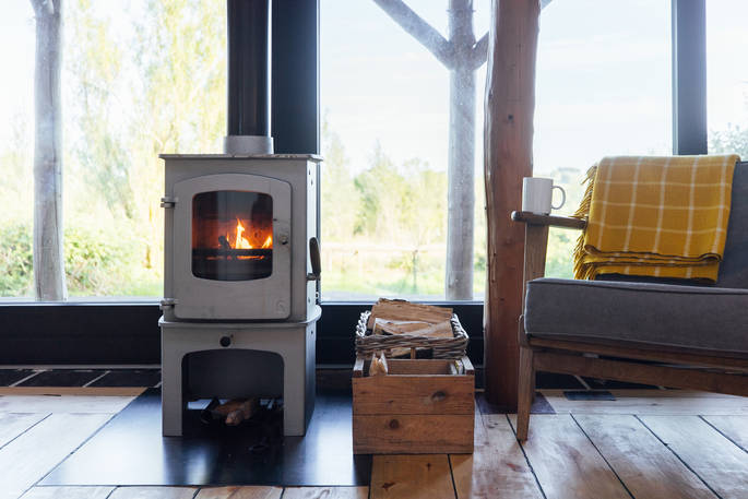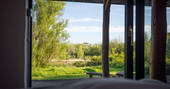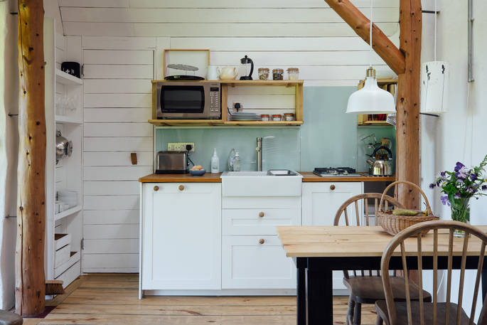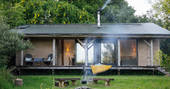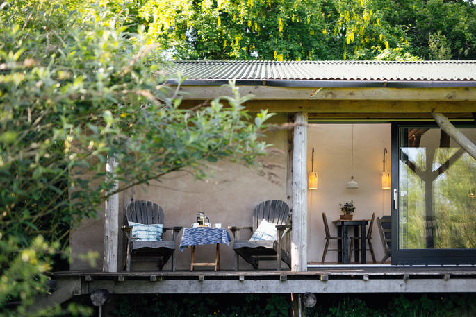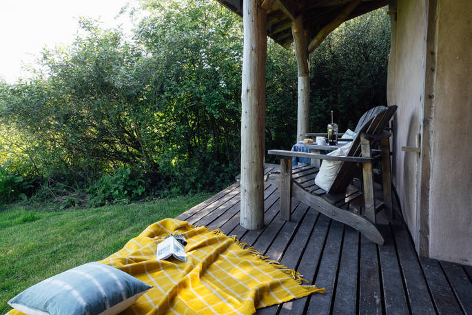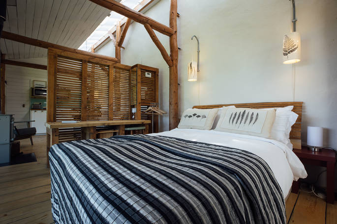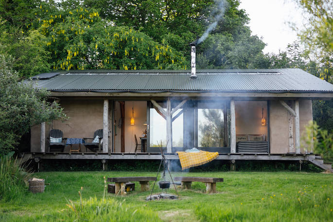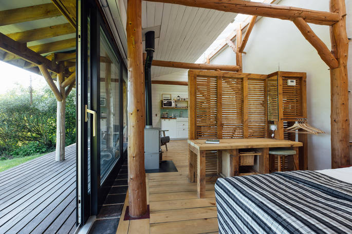 From the broad veranda, you can see fields, hills and nothing else to remind you that civilisation is out there. The bed’s at one end, the kitchen at the other, the lounge in the middle and views from everywhere thanks to big glass doors along the whole length.