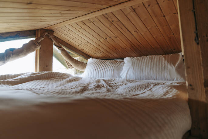 - The treehouse bed is up on a mezzanine accessed by a ladder