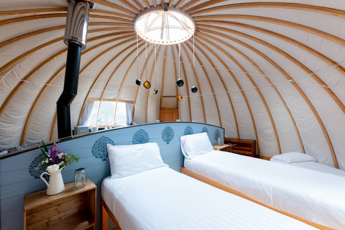 - Each accommodation tent can sleep up to 5 adults or 4 adults + 2 children in 1 kingsize double (splits into 2 singles), 2 truckle beds and 1 sofa bed for 1 adult or 2 children