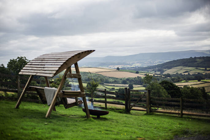 The Seren Mawr geodome is a friendly competition between the inside and the outside for the title of most impressive view. Outside, the Brecon Beacons reach away from the hilltop site, stretching in misty folds for miles. Inside, intense scouring of antique shops and auctions has resulted in a lavish version of frontier style, all furs and blankets and dark wooden furniture. The two are brought together by the clear picture window that spans five whole metres of the eight metre space, as well as the sofa and the bed, both perfect places to snuggle and watch the sun set on the hills. You’ll also get pretty good views from Ty Bach, the little house behind the dome which houses the shower and loo, but the best way to enjoy the stunning scenery has to be while soaking in the wood-fired hot tub.