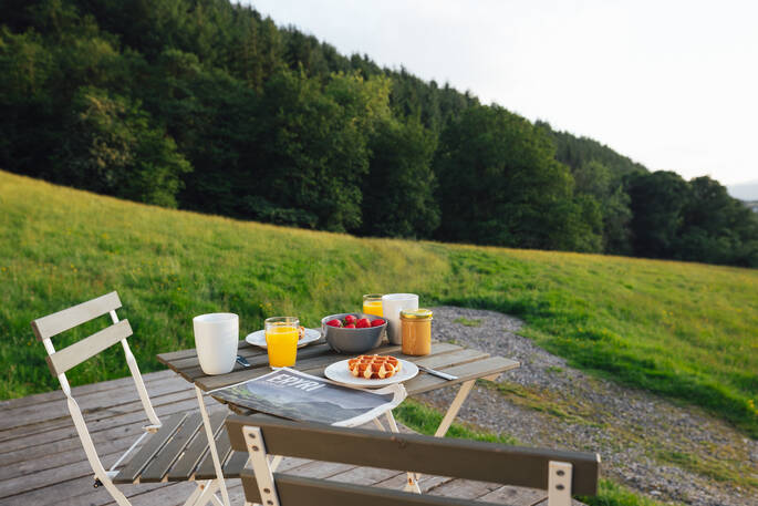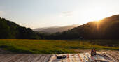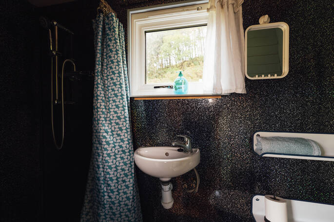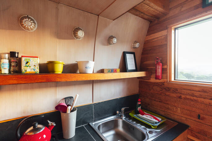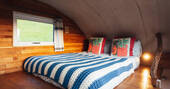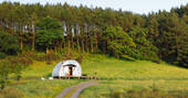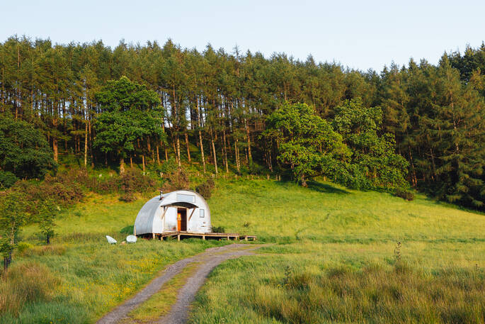 The latest addition to the handful of spaces scattered over the hillside at Beudy Banc is another curved cabin perfectly designed for the mud-seekers, the adventurers and the off-roaders. Bike trails and hiking routes cover the farm, the Dyfi Forest and most of the surrounding area, making it one of the best in the UK for mountain biking. Downhill bike trails wind through the forest right to the door, where you can ditch the gear under the awning or the deck, stick the kettle on the gas hobs and slump onto the wide sofa in front of the view through the sliding doors.