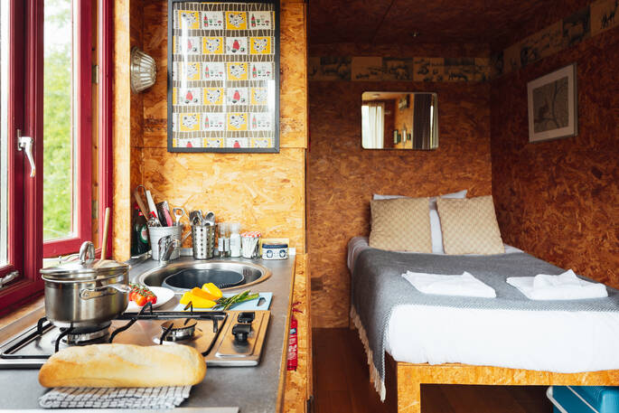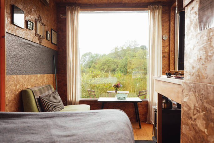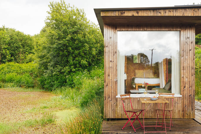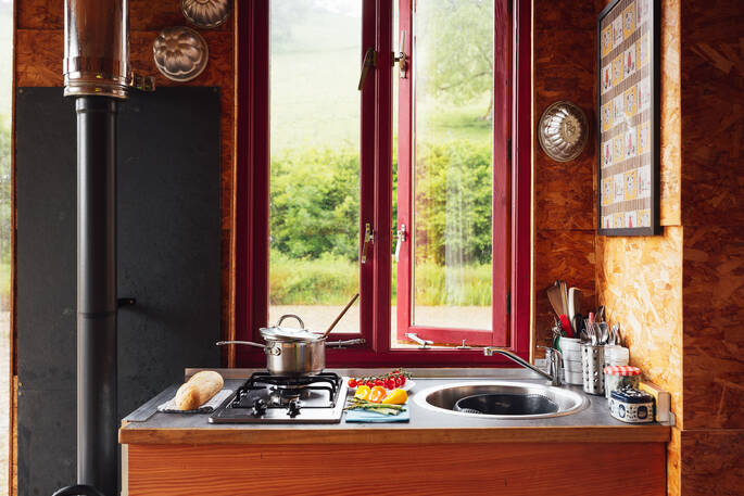 Caban Cilfa offers you relaxation or adventure in equal measure. Grab a good downhill bike, hit the miles of fabulous trails that cross the hillsides and, if you’re feeling brave, take a dip in the pond to cool off when you get back – and less brave, book a spot in the sauna with a plunge pool. There are induction hobs for cooking simple meals and the en suite bathroom has a hot shower and a compost loo, all of which are neatly fitted into the cosy cabin.