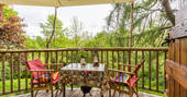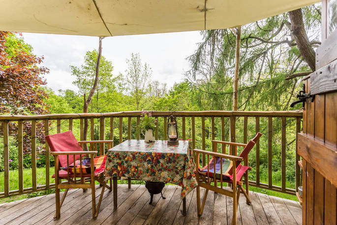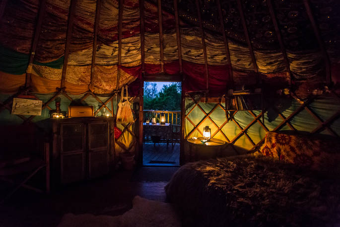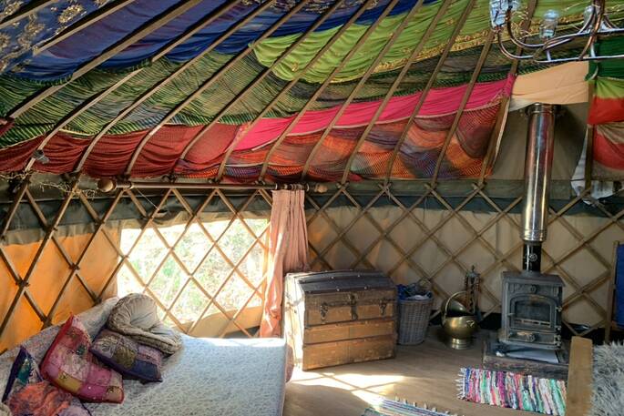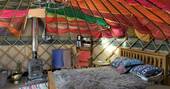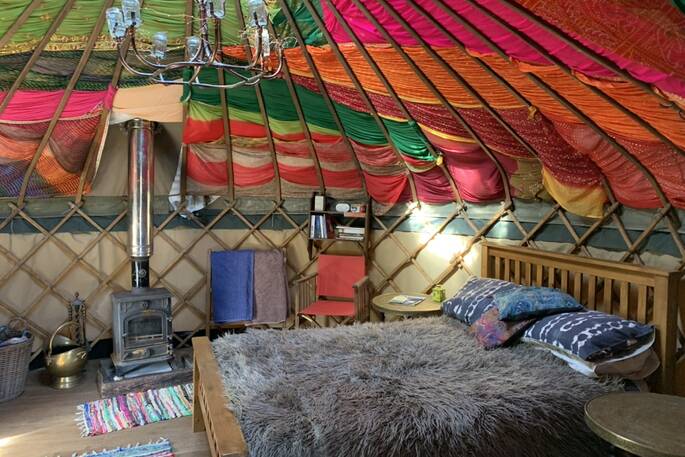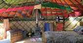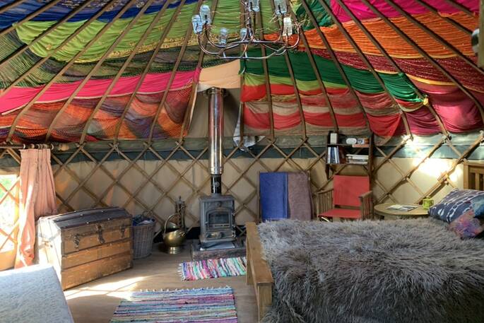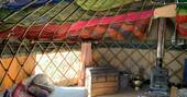 The mismatched, quirky furniture give Old Larch Yurt a relaxed, colourful and Bohemian feel. There’s a wood burner and sheepskin rugs to ensure you're cosy whatever the weather.