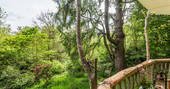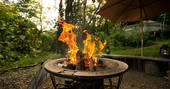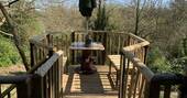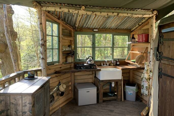 Out on the raised yurt deck is a private outdoor kitchen, sheltered under a large canopy, so you can sit outside at the table in case it rains – and enjoy cooking on the Ooni Pizza oven, whatever the weather. There’s also a firepit, alongside a hammock and wonky swing, all of which are for your private use.