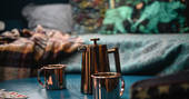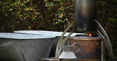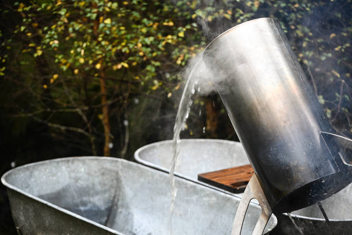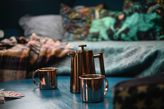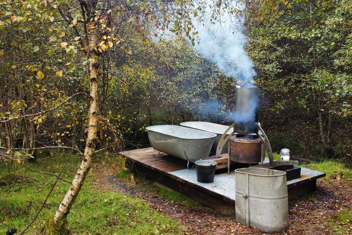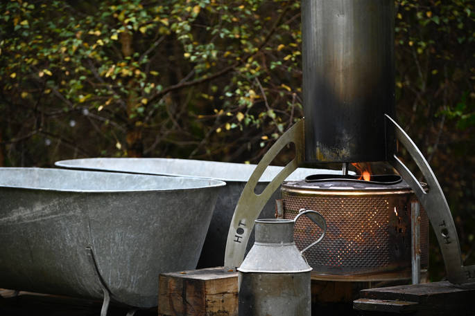 This is a space perfect for wild-hearted couples who enjoy chopping wood, building fires and embracing the outdoors. Inspired by the Japanese art of Shinrin-yoku (forest bathing), outside you can fill your twin Scandi-style tubs with stream water, heat them with a traditional ghillie kettle, and soak under the moonlight in total privacy or enjoy a woven hot outdoor shower.