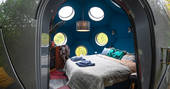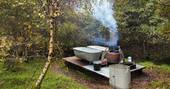 Inside, a wood burner and modular furniture offer warmth and comfort after a day outdoors. At night, the sky portholes reveal the majesty of the unpolluted Welsh Dark Skies. Step into your private pentagonal dining pod to cook up a feast - you'll have a choice of gas stove, fire pit or pizza oven - and dine surrounded by trees and serenaded by hooting owls.