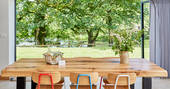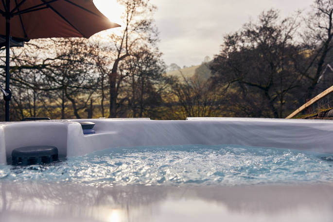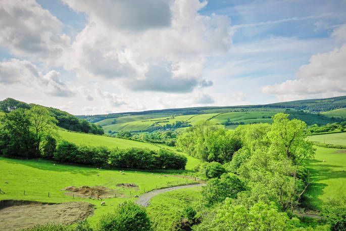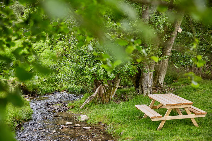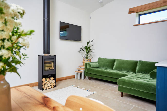 This incredible space blends seamlessly into a sweeping hillside in the lovely landscape of Powys, surrounded by lush green, the farm’s sheep and cows, and absolutely nothing else. The spot is tranquil perfection and you can throw open the metres of folding doors and make the broad patio an extension of the chic lounge. The space is colourful and classy, with a copper bath tub in the main bedroom and a very large double shower in the bathroom used by guests in the three-person bunk room. Spend a bit of time stretched out on the huge corner sofa, then wander out to sit by the firepit, take a dip in the hot tub or go down to the stream and set up lunch on the picnic bench. With the Elan Valley Dark Sky Park just round the corner, you’ll be treated to incredible starscapes on clear nights and if you’re quiet you might hear and see all kinds of wildlife. Badgers, foxes and deer all live in the area, there’s a huge amount of birdlife, especially surrounding the large pond at the bottom of the garden, and even elusive otters. The sheep, slightly less elusive, may come and peer in the lounge window from time to time, but they’re fenced off and more skittish than they are curious.