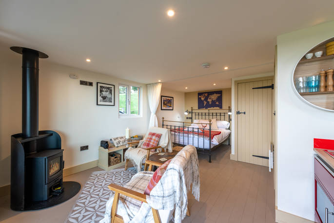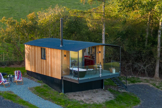 The approach to Pen Vyrnwy is one of those hill climbs on which, if you were walking, you’d stop to take a photo every few steps, believing that this is surely as good as the view gets. It only really peaks though, when you arrive on the deck that seems to be sailing into the distant hills. This sight will be the permanent backdrop to your stay, whether you’re by the fire, outside in the Jacuzzi tub or even waking up early to watch from bed as dawn creeps over the hillsides. Inside the cabin, you’ll find a space that does its best to match the landscape for heart-warming colour, and more than enough to keep you in style and comfort. There‘s a modern kitchen and drench shower, along with big armchairs to sink into after a day exploring the area.