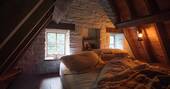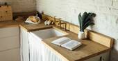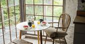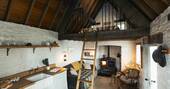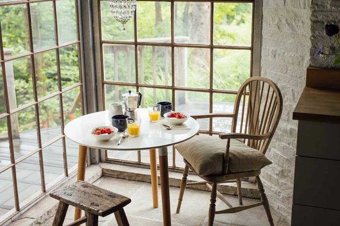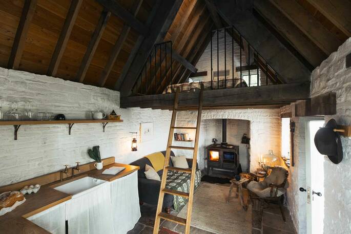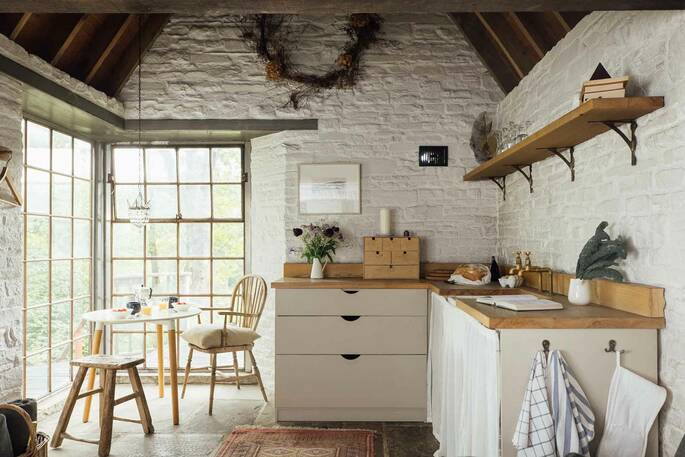 Inside, the whitewashed walls, a wood burner at the heart, and exposed wooden beams give a carefully curated contemporary aesthetic, with a nod to its former rustic appearance. You’ll spend mornings cooking up a simple breakfast on the wood burner, making use of its oven – before carrying the food over to the table and bathing in the morning light from the picture windows that make up the corner of the space.
