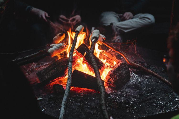 Embers are actually preferential to a roaring fire, as tempting as it is, as actual flames might burn the dough. Embers, however, provide the heat without the burn risk. Prop them up, or hold them, making sure to turn so they cook evenly.