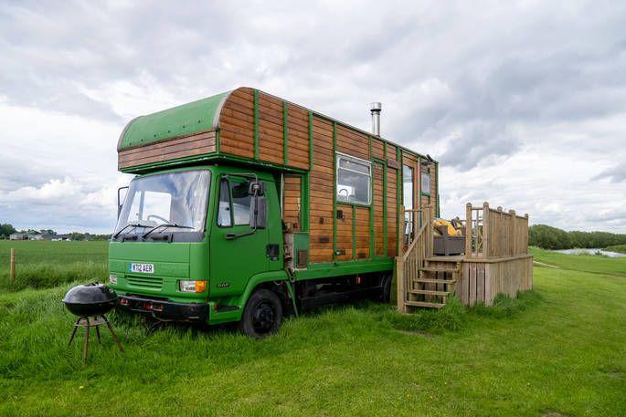Well-established, beautifully kitted-out and in a corner of dreamy Cornwall, you're welcomed to Tree of Life with produce from the organic smallholding next door - Marie and Sylvia run a veg box business, so know their stuff. You sleep on a double bed above the cab of the lorry itself, accessed by steps that double as the cupboards. Lighting is provided by solar panels, and romance by lanterns and tealights. Whip up a feast in the small, fitted kitchen with gas cooker and oven after a day on the beach in St Agnes.