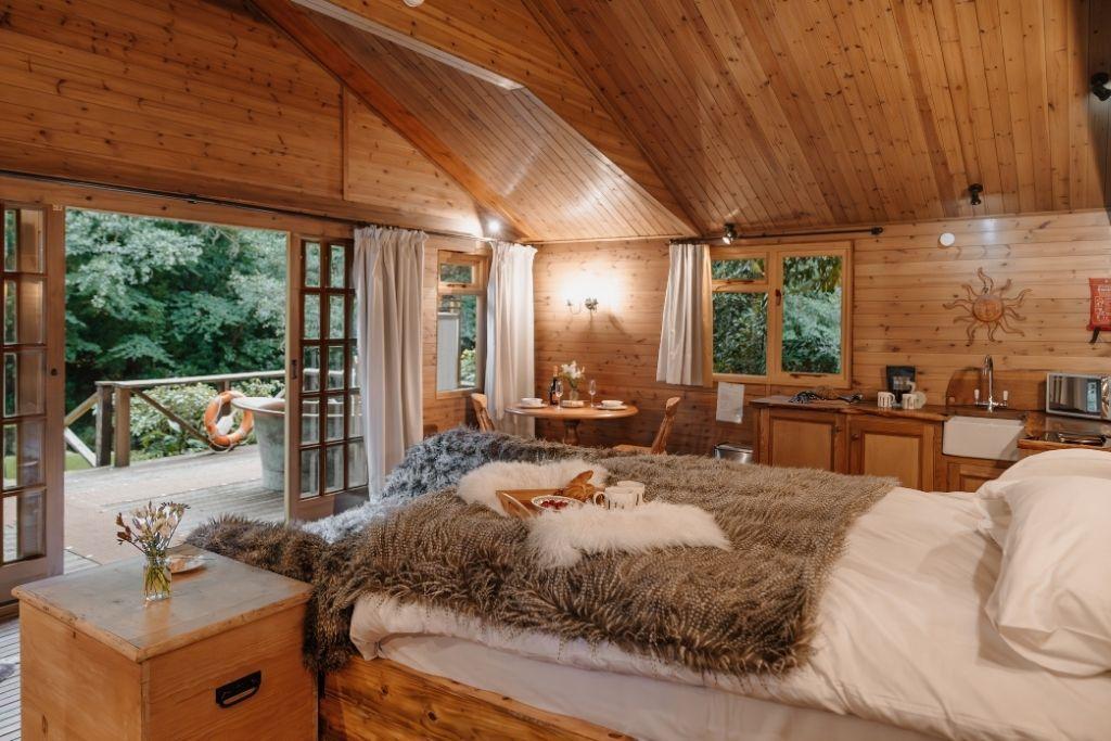 You’ve found ‘Devon on earth’ with a side order of Scandi sophistication at Holly Water Cabin. The pale wood interior with accents of copper, leather and stone makes the perfect backdrop for minimoon photos. Equally photogenic is the gorgeous outdoor copper tub, designed for sunset soaks and stargazing.