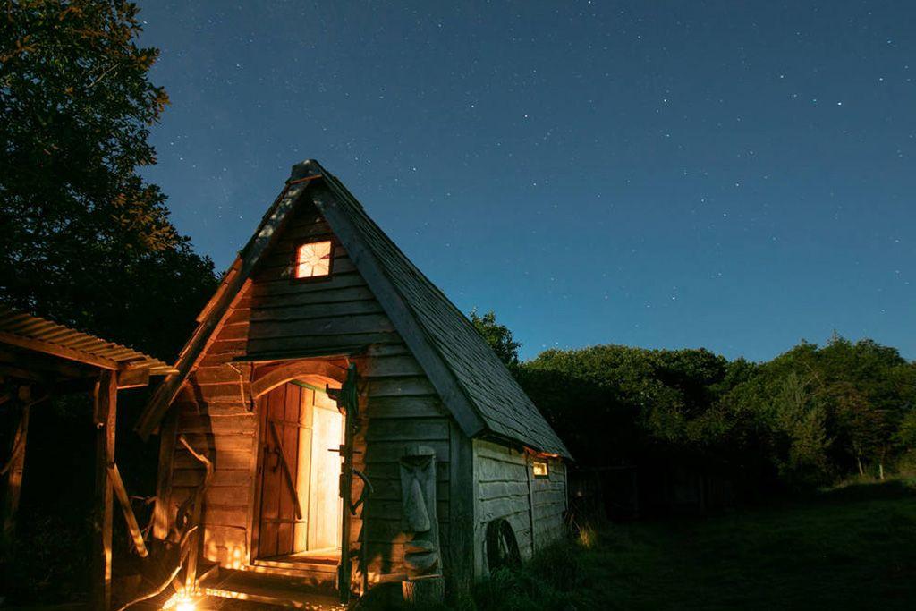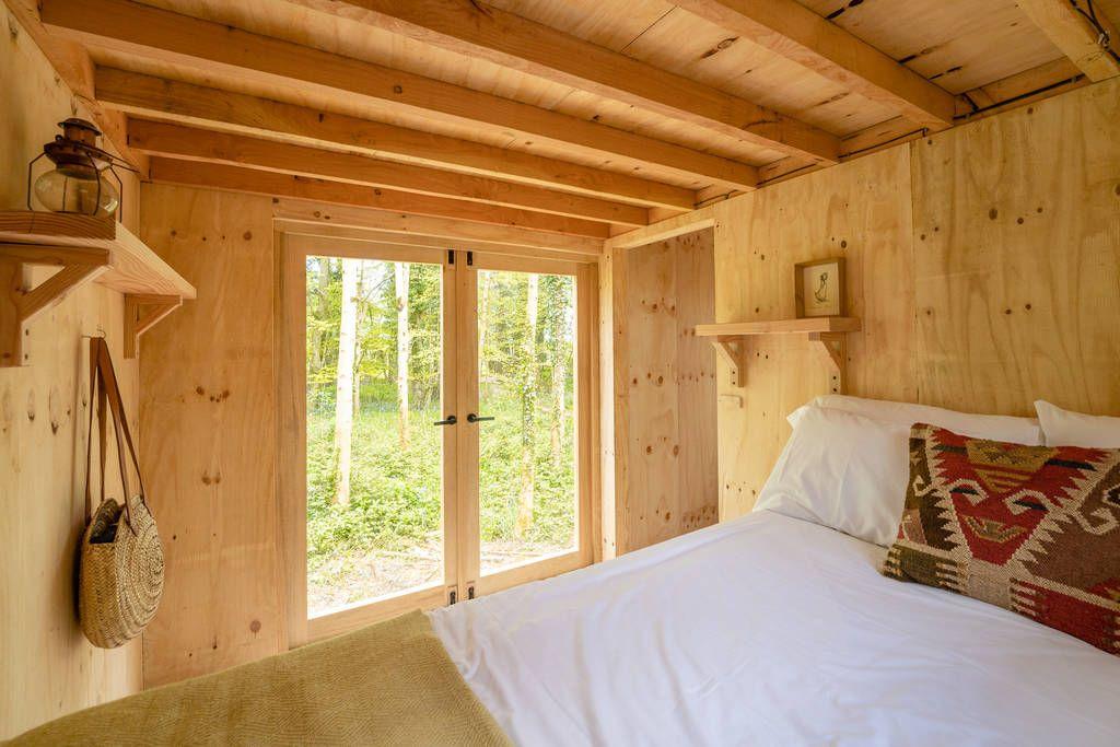 On Campwell Farm, Abel’s Cabin strips life back to basics with a woodburner, hammock and outdoor bath beneath the trees. Inside, there’s just the essentials – shelves, hooks, beds, so the forest becomes your living room.