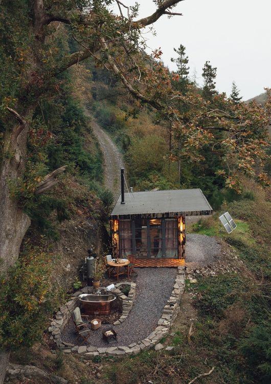 Built into a wooded hillside overlooking treetops, Serendipity lives up to its name. Mornings begin with coffee to birdsong, days are for woodland walks or coastal rambles, and nights end with a film projector or a soak in the wood-fired bath beneath the stars.