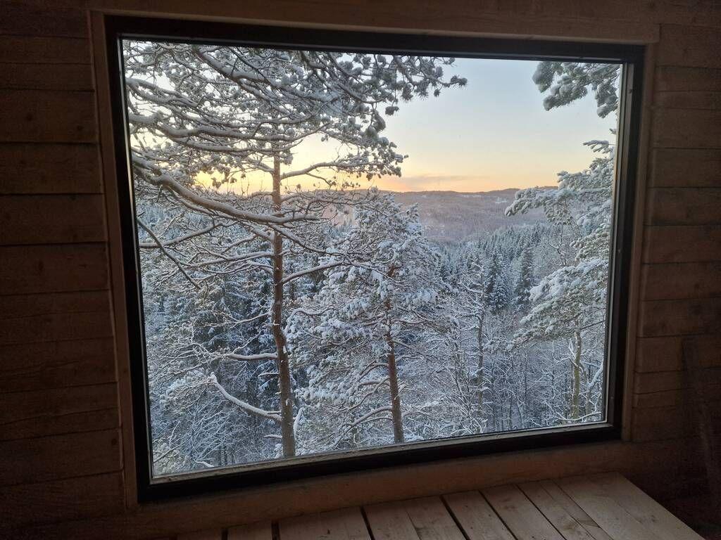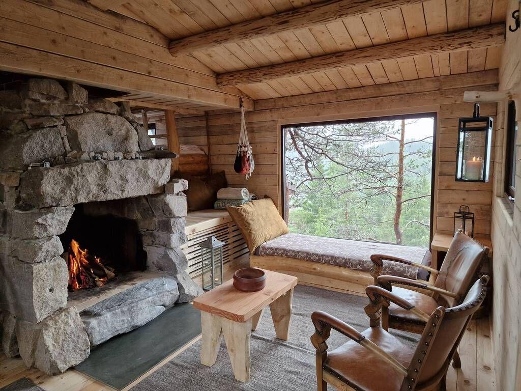 Giant picture windows welcome in the staggering forest views, while the scent of the pine trees from out on the deck puts every Christmas candle you’ve ever bought to shame. Designed for a group of hardy souls, there’s a compost loo 20m from the cabin and an invigorating outdoor shower (with hot water) but indoors the wood burner and open fire keep things deliciously snug and cosy. Bring a few books and you’ll lose hours in the most scenic reading nook we’ve ever seen where you can gaze out of the huge picture window at the winter wonderland that unfurls below.