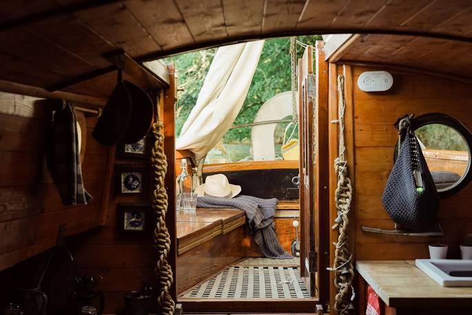 Oyster is a tiny cedar-clad boat moored on the banks of the River Yealm. Accessible only by boat or a winding footpath through woods, it’s a place where you can wake with the tide and slip into cold water before warming up with a coffee on deck.