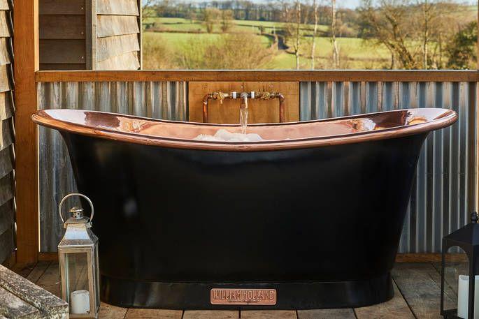 Opulent immediately springs to mind when you step inside Dimpsey Dapple, perched in the Blackdown Hills in Somerset. You won’t like to brag but you’re actually getting two huts, connected by an interior walkway. The front hut houses the kitchen, table and comfy lounge seating area with a stargazer roof overhead, while in the rear hut you’ll find a gorgeously romantic bedroom with a starlit LED ceiling. Outside, the owners have upped the ante even further by installing a grand William Holland copper bath under a curved roof. It’s the perfect spot to unwind, taking in spectacular views of the rolling fields by day and a blanket of stars by night. If you’re out to exceed your partner’s glamping expectations in style, Dimpsey Dapple is ready to oblige.