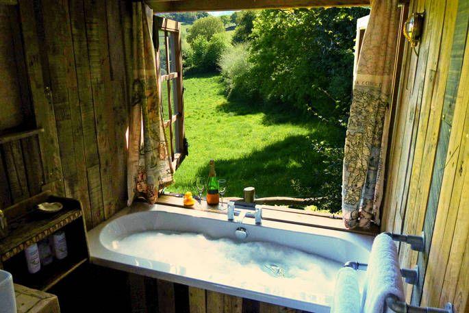 Taking forest bathing to a whole new level, Orchard Wagon in Devon has evolved from the owners’ deep love of the woods. Through Matt’s expertise as a tree surgeon and Amanda’s conversation work, they’ve created a private, sustainable woodland hideaway with a shepherd’s hut, field kitchen, compost loo and bathing hut. They’ve used as many local and recycled products as they could get their hands on, including carving the bed from chestnut coppiced in their own woodland. Once you’ve settled in, heat up the bath and settle in for a long, relaxing soak with incredible views over wildflower meadows and Haldon Forest. You might spot wandering deer and soaring buzzards in the distance as you luxuriate in the water with a glass of wine.