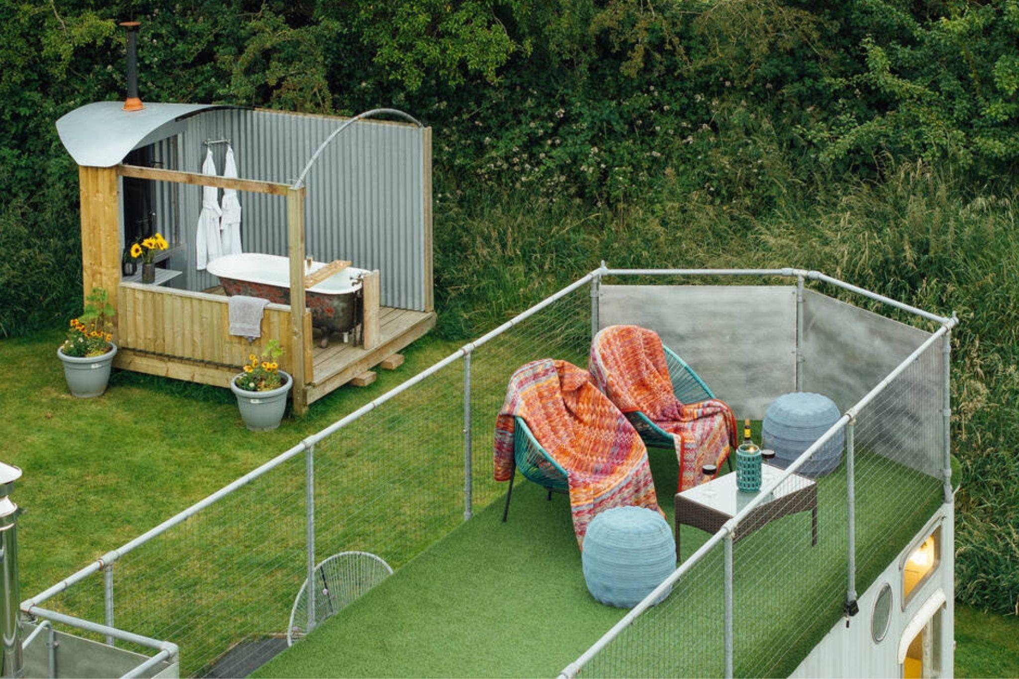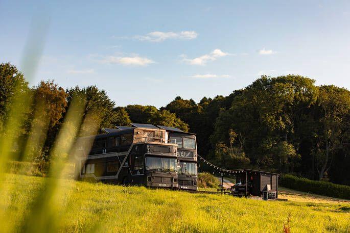Climb aboard a double-decker stay that rewrites the glamping rulebook. Double-Deckerdence is two buses stitched together, giving you a generous open-plan kitchen/lounge upstairs, countryside views through big windows, and a rooftop hot tub.