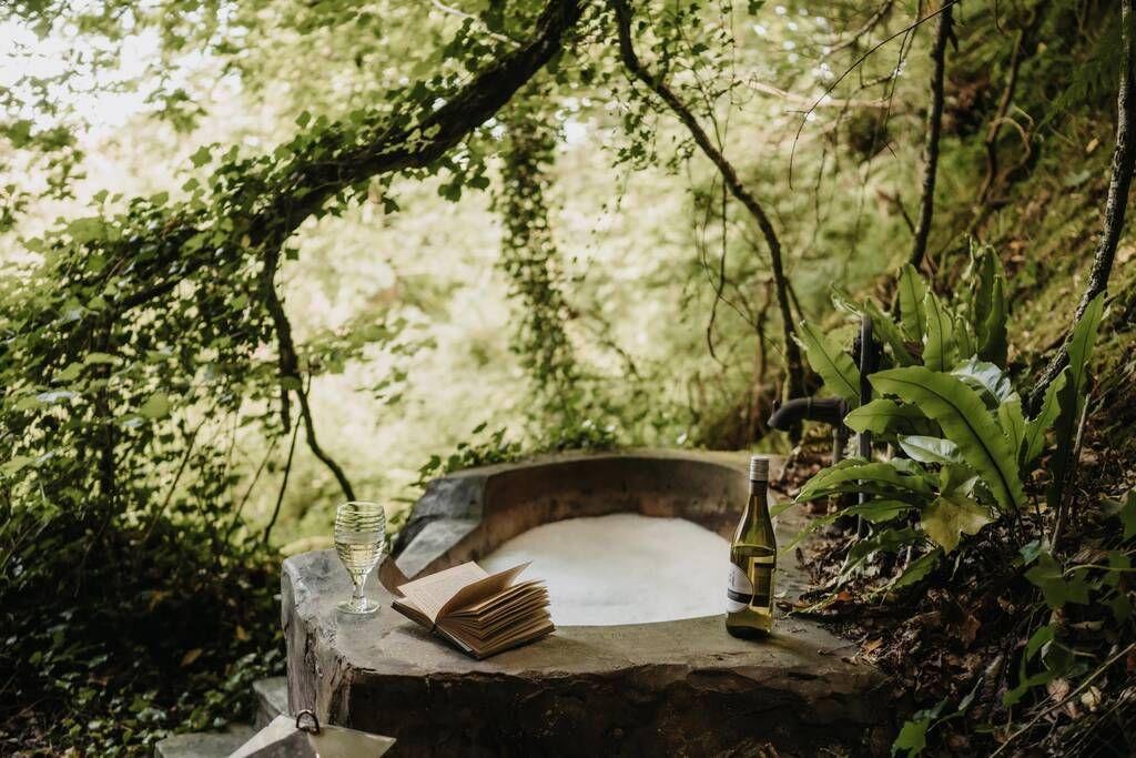 Bathtime here is sacred. It’s taken outdoors, sunken, surrounded by greenery. The covered kitchen and dining space means you can cook and eat alfresco, even in a downpour. Paths lead to firepits, woodland seats and skies full of constellations.