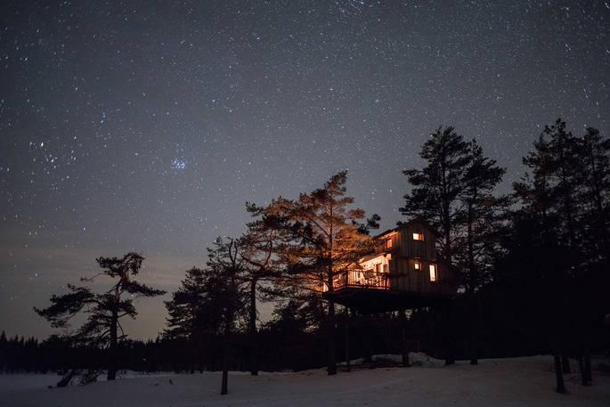 Lifted towards the heavens on your own private island, it feels like you’re merging with the vast Norwegian skies at The Island Cabin, elevated on a platform between three pines. At night the inky black skies are bright with stars and if conditions are right, you might see the Northern Lights. After crossing the lake by kayak or floating bridge to arrive at the cosy cabin on stilts, you’ll find a surprising amount of room for five to sleep, with two in a double bed and an ingenious bunk room for three.