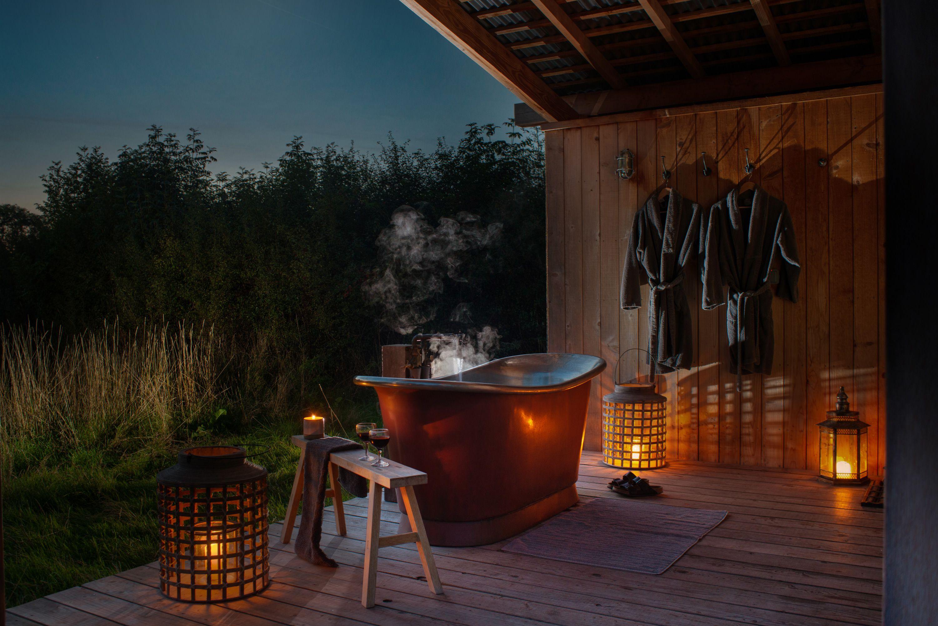 Shower like Welsh royalty at Oaken Fort in Powys. The outdoor shower on the deck overlooks a sweeping kingdom of rolling hills and misty valleys to be admired as you scrub your back. This is glamping grandeur at its finest with a copper bathtub in the bedroom, a look out bar, hammock, huge picture window, sheepskin rugs and a luxurious hot tub. Set off in any direction from the fort and you’ll find outdoor adventures whether it’s a walk along Offa’s Dyke trail, a hike in the Black Mountains, a visit to historic Ludlow or a trip to the spectacular Elan Valley Dams in Rhayader.