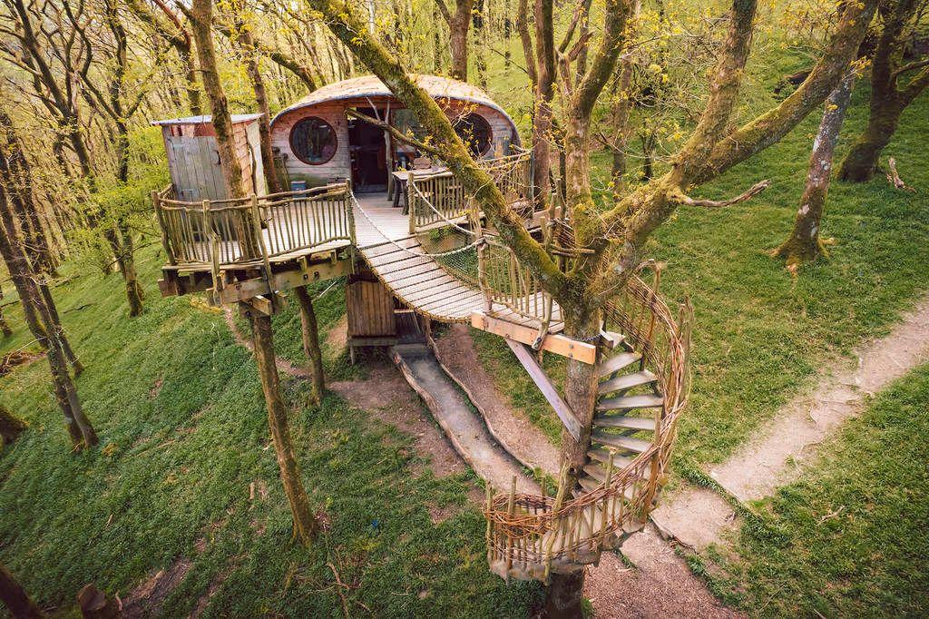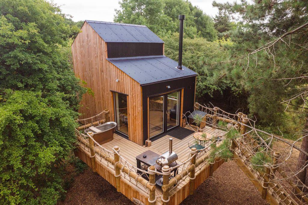 This one proves that travelling without a car doesn’t mean settling for smaller stays. Catch the train to Barnstaple, then the local bus to Hartland and walk seven minutes to arrive at a multi-storey treecabin with a wood-fired hot tub and private cinema room.