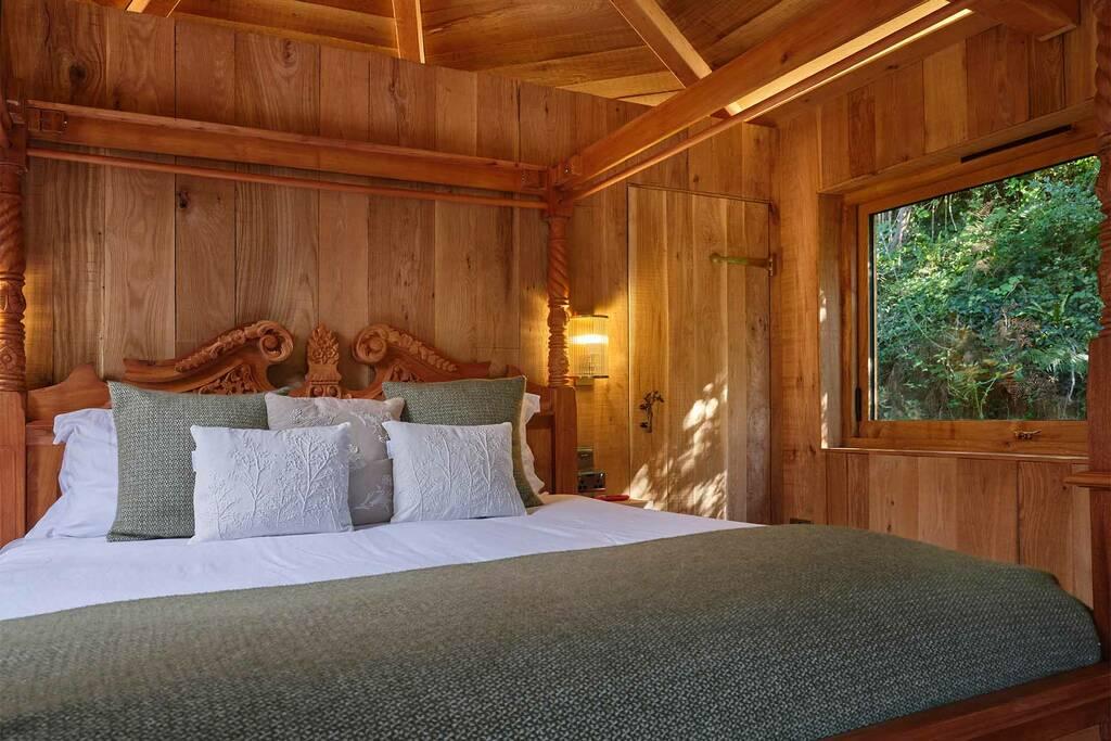 Bryn Meurig Bach is ideal for travellers who want to arrive by train and then disappear into the landscape. Hosts can arrange pickup from Machynlleth station, delivering you straight to a treehouse set thirty feet above the ground. Walking routes begin at the door, from gentle woodland loops to longer mountain hikes with views across the Dyfi Biosphere. There’s a pub around a mile away, wildlife on site and maps provided for exploring without needing transport. It’s ideal for outdoorsy families who want the kind of adventure that doesn’t require driving to a car park first.