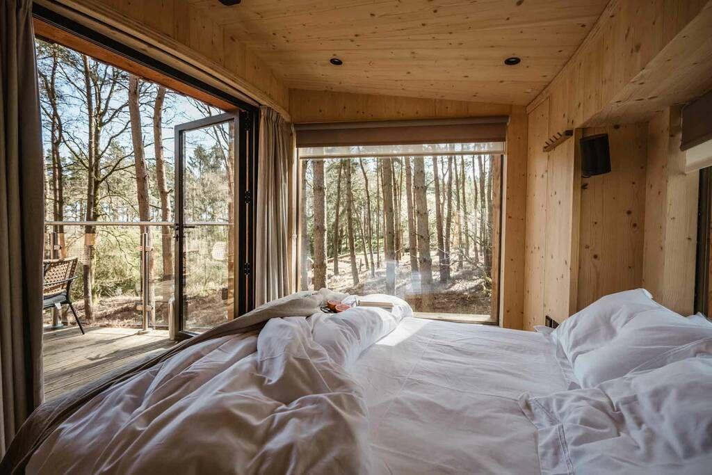 Architecturally bold and beautifully minimal inside, this treehouse blends Scandinavian design with childlike wonder. The net transforms night-time into an experience rather than an afterthought, and stargazing from a floating net feels like cheating gravity.