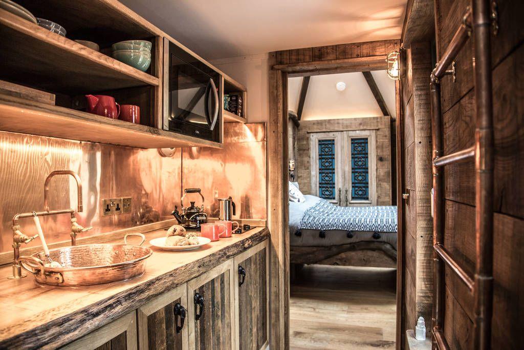 Everything here is organic and deeply connected to nature, from the king-sized bed carved from stag oak, to the bath salts, candles and the woodland setting. It feels like a total escape from modern life, but with the luxurious touch of the huge outdoor bathtub adding some foamy, delicious luxury. After a long soak, stroll inside and stretch out on the sofa with the wood-burner glowing and a glass of chilled champagne in hand. Or, if you fancy living a little wilder, head down to ground level and get the firepit or the BBQ going for al fresco cooking or toasted marshmallow desserts.