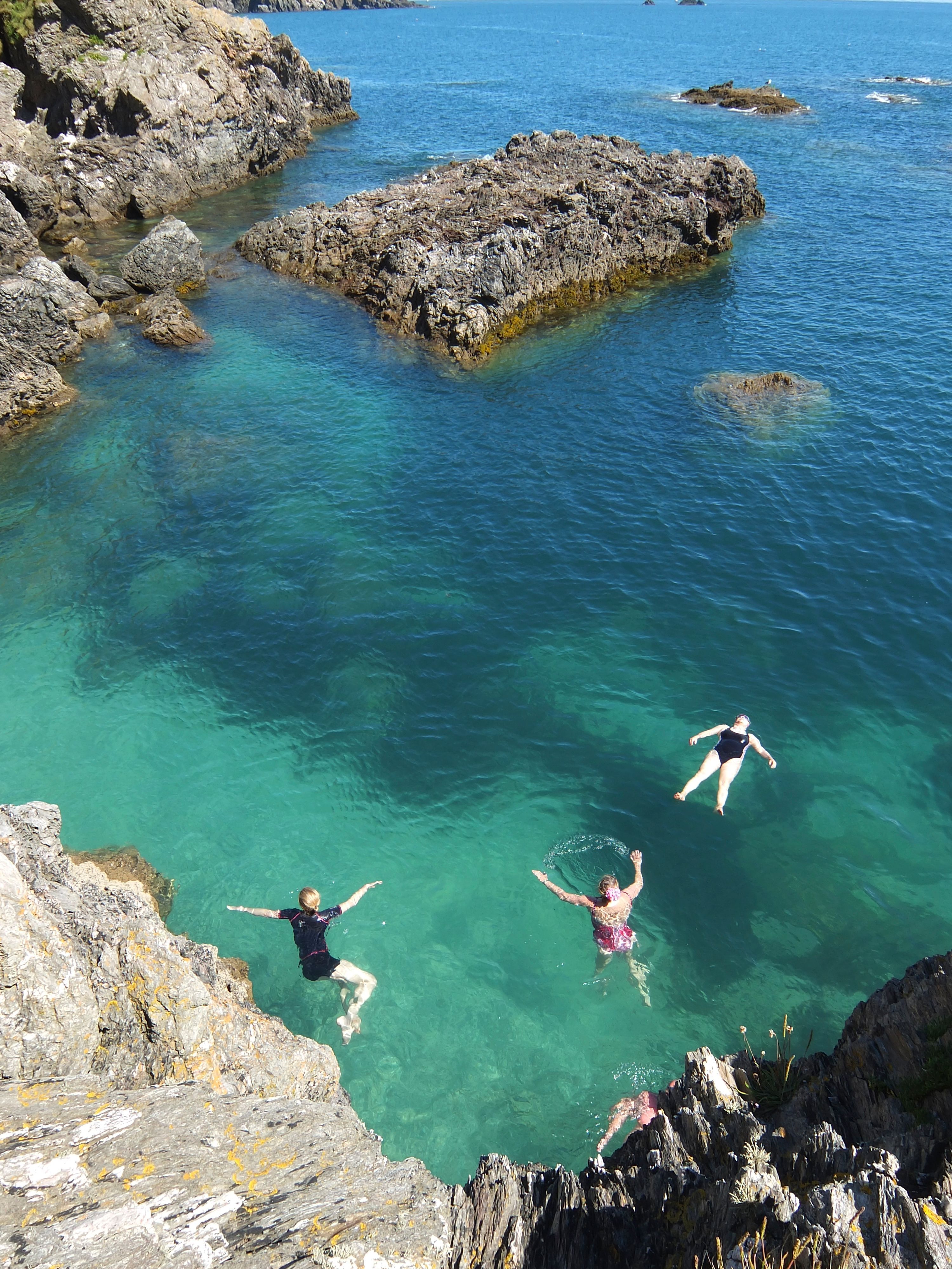 Head on east to Trefin with its ruined mill on a stream leading down to the beach. Next is Porthgain, a pretty harbour village with a fine dining fish and chips restaurant and the Sloop Inn. Climb out of the harbour to pass the remains of several old quarry buildings. From here there are more treats, including a swim through a giant arch at Porth Dwfn, the fine wide sands of Traeth Llyfn and finally Abereiddi’s famous ‘Blue Lagoon’, a disused quarry long since breached by the sea to become an inland lake. The quarry’s old wheelhouse provides three platforms for leaping into the deep blue abyss below – a famous rite of passage for local swimmers and visitors alike.